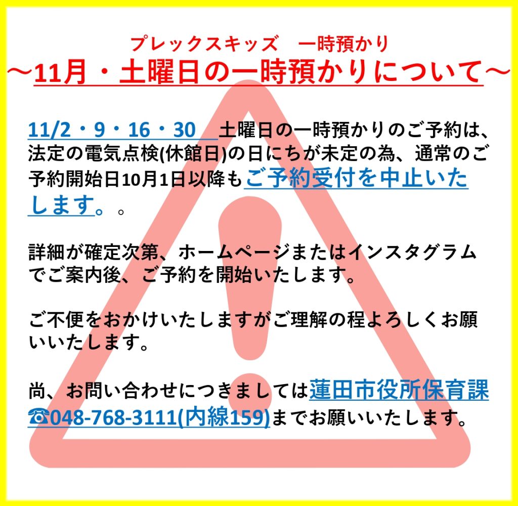 11月土曜日(2・9・16・30日)の一時預かりのご予約につきましては、施設の法定電気点検の日程が未定の為、11月分予約開始日10月1日以降もご予約受付を中止致します。
