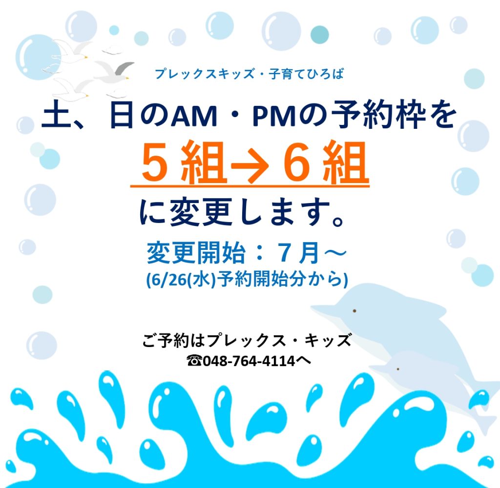 6月26日(水)予約開始分の7月の土日の午前・午後のひろば予約枠を、5組から6組に変更となりますので