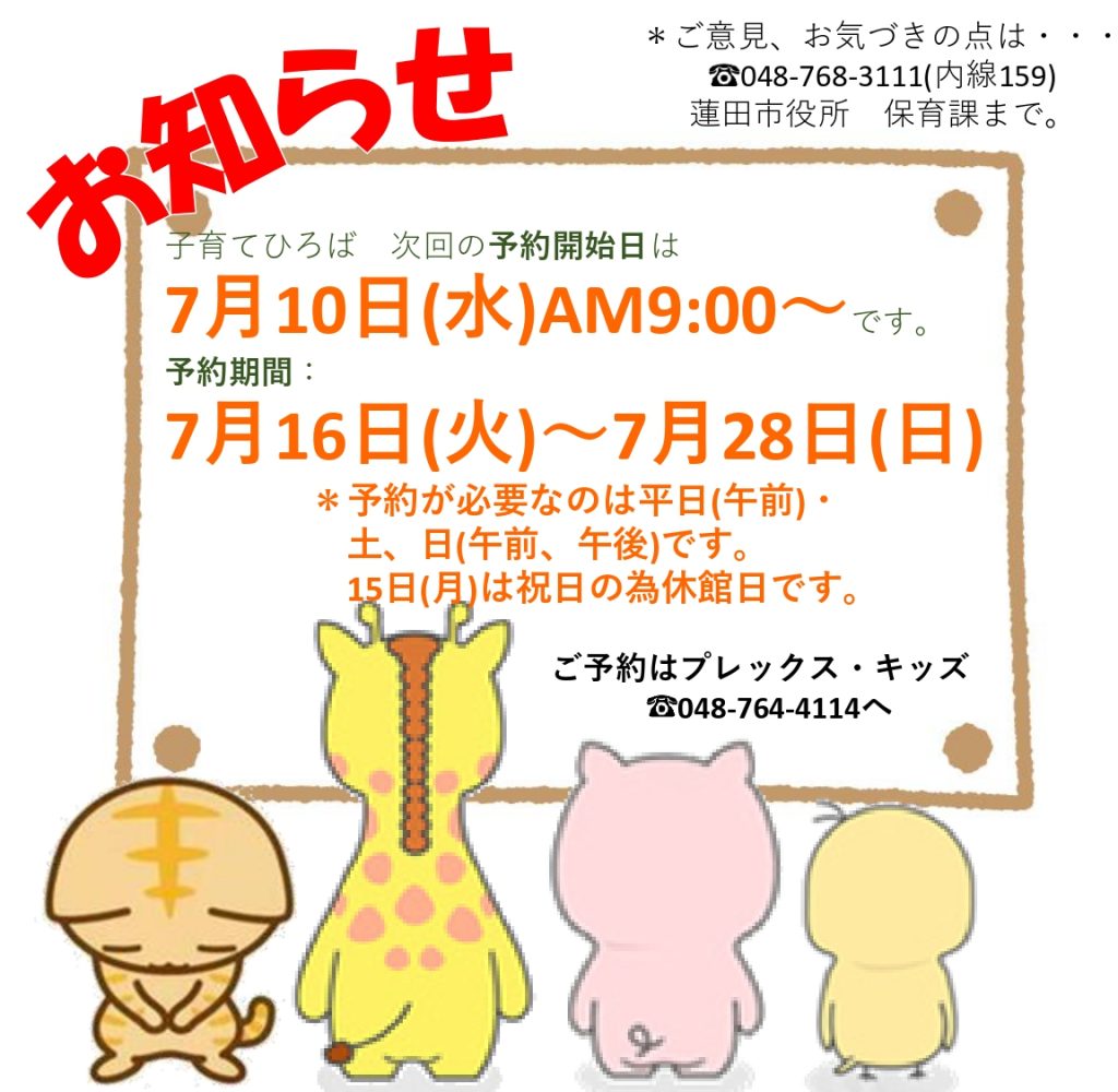 7月16日(火)から7月28日(日)の子育てひろばに予約開始日は、7月10日(水)9時からとなります。