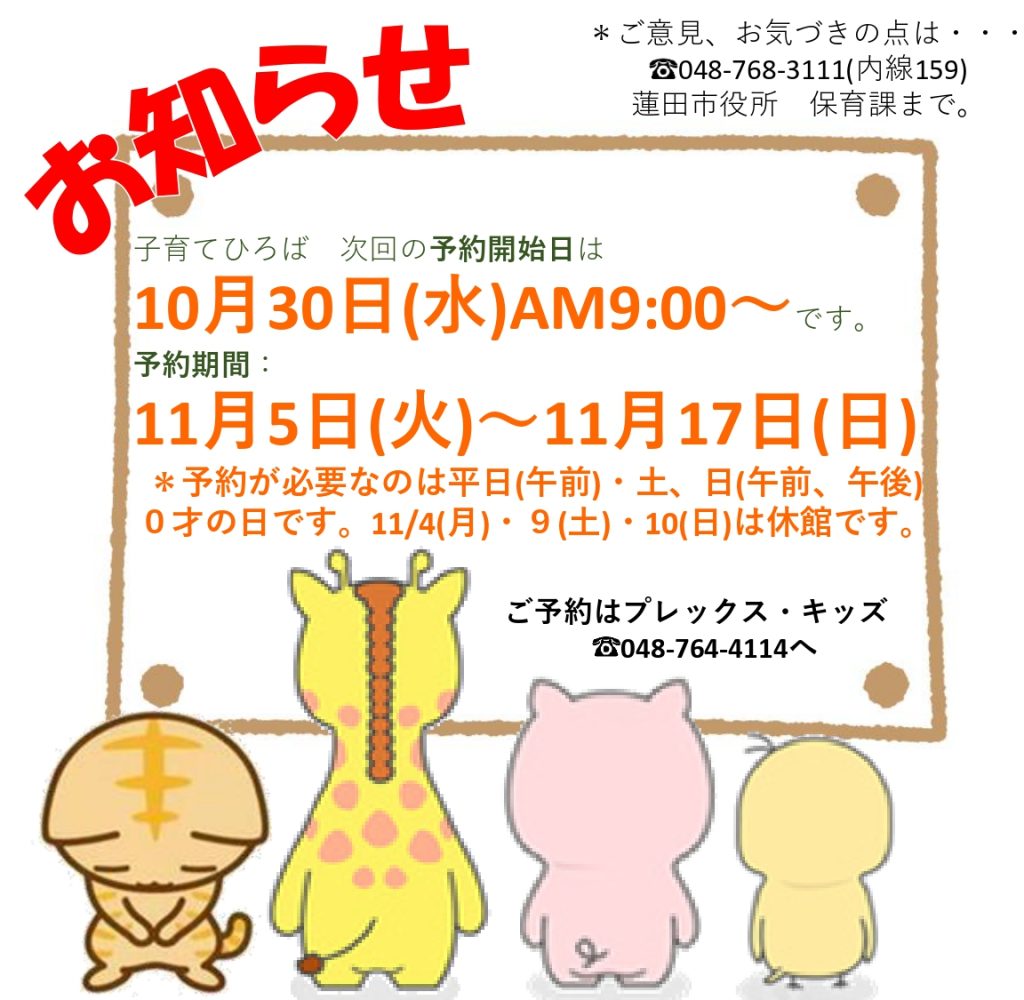 子育てひろば予約開始日(11月5日~11月17日利用分)のお知らせ