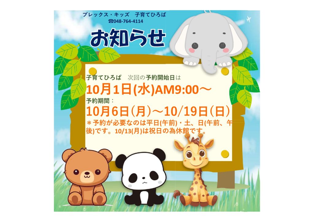 10月6日から19日の子育てひろばの平日午前、土日終日の予約開始日は、10月1日午前9時からとなります。
