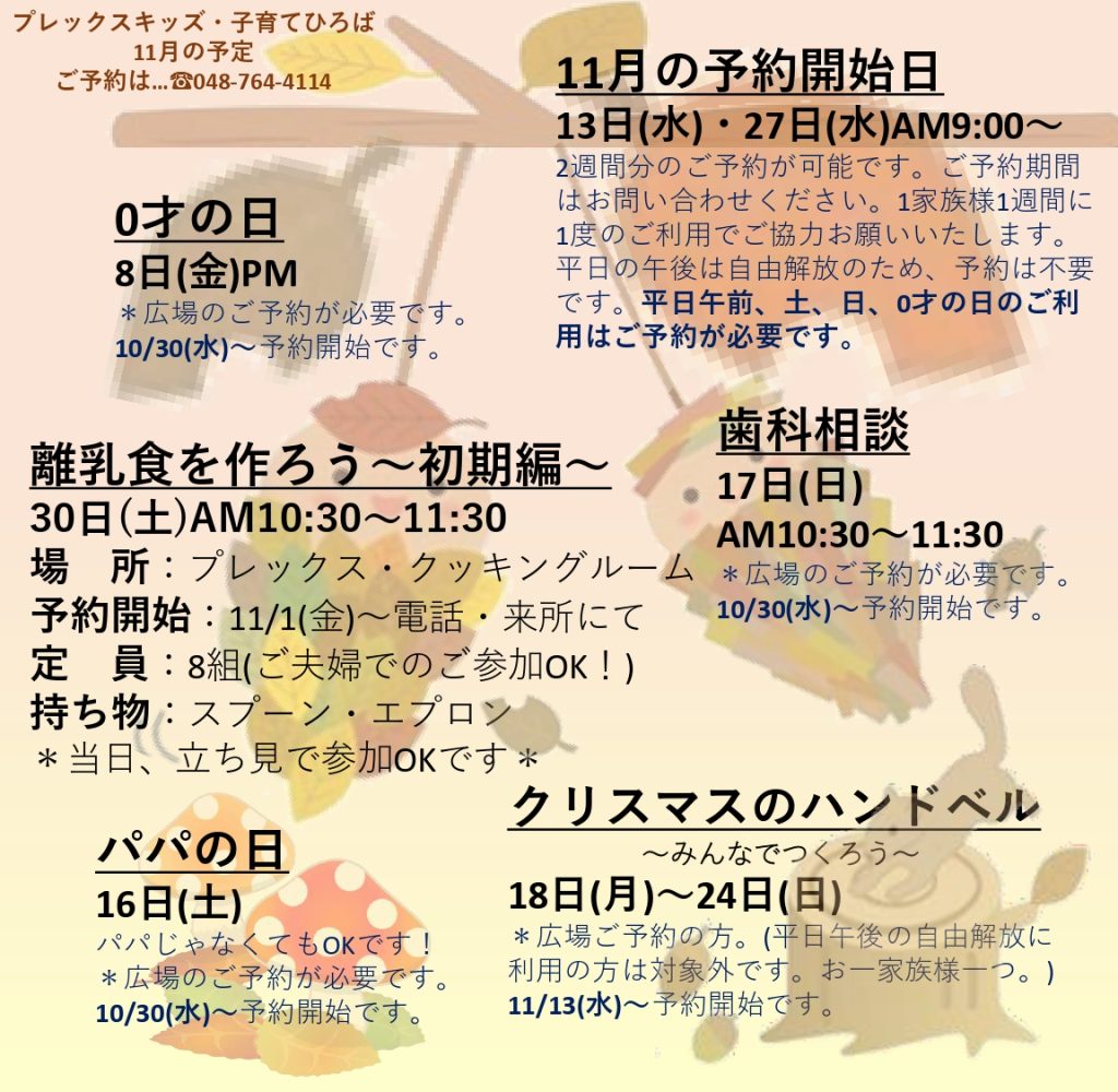 子育てひろばの2024年11月の予定です。新たに栄養士による離乳食に関する講座が開催されます。