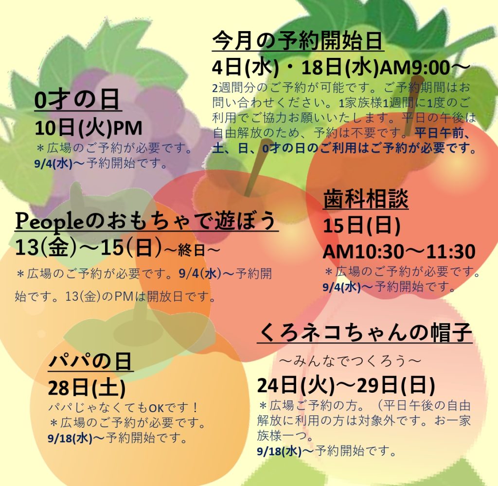 子育てひろばの2024年9月の予定です。まだまだ暑い日が続きますが、遊びに来てくださいね!