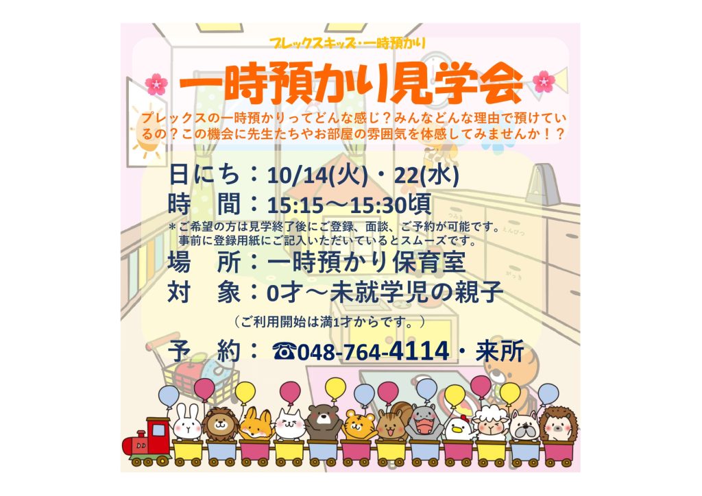10月の一時預かり見学会は、14日・22日の15時15分~30分頃となります。