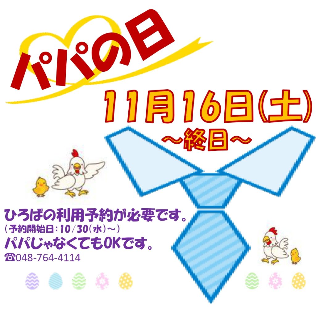 11月16日(土)はパパの日となります。ひろばの利用予約が必要となります。予約開始日は10月30日(水)9:00からです。パパでなくもご利用頂けます。