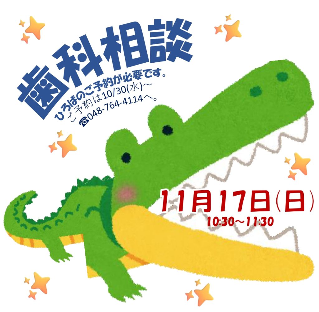 11月17日(日)10:30~11:30は歯科相談の日です。ご相談にはひろばのご予約(10月30日(水)~)が必要となります。