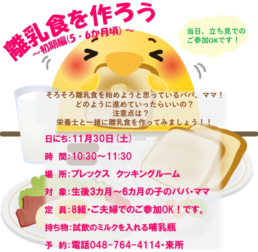 11月30日(土)10:30~11:30にプレックスクッキングルームにおいて、生後5・6か月頃のお子様向けの離乳食講座を