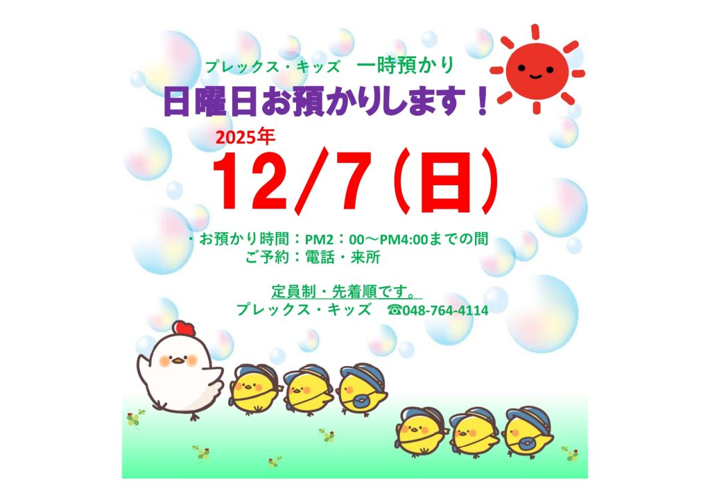 12月の日曜日一時預かりの日は、12月7日(日)の14時~16時までの間となります。