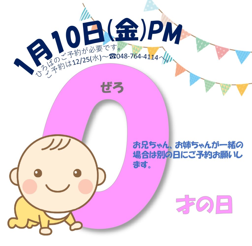 1月10日(金)の午後のひろばは0才の日です。ご利用に予約が必要です。ご予約は12月25日(水)からとなります。