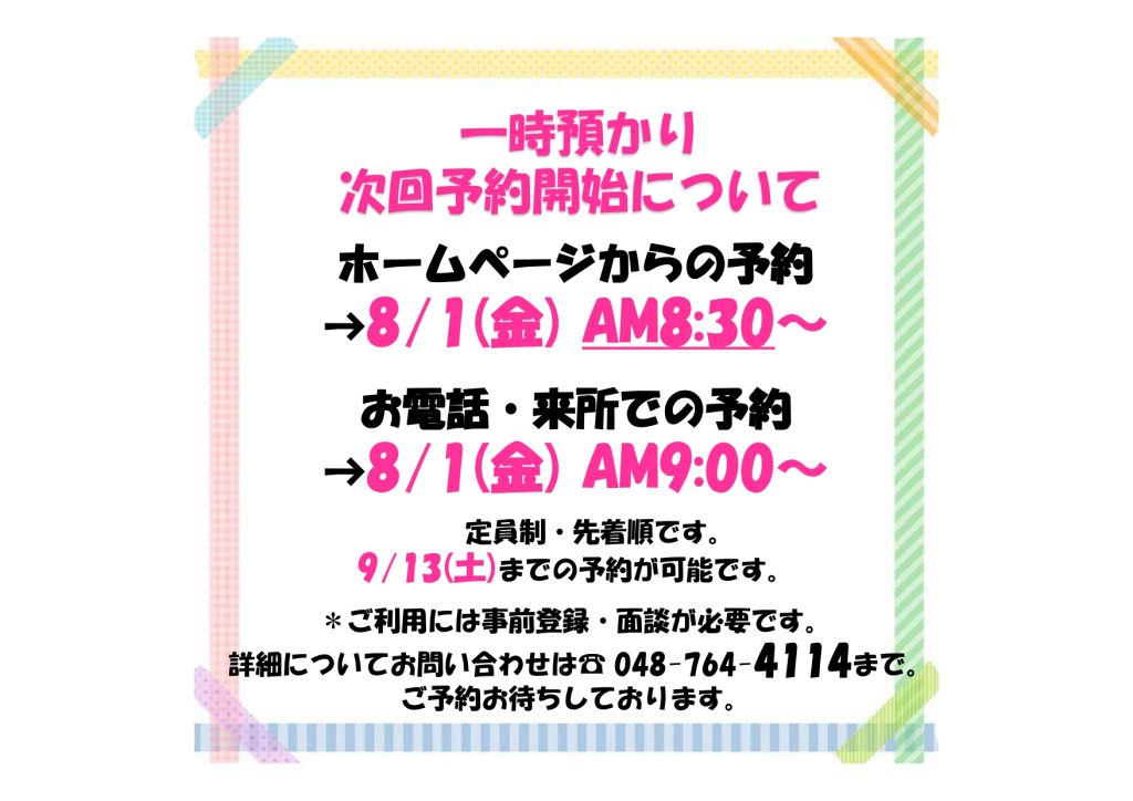 2025年9月1日~13日の一時預かり予約開始日は、ホームページからのご予約は8月1日(金)午前8時30分から、