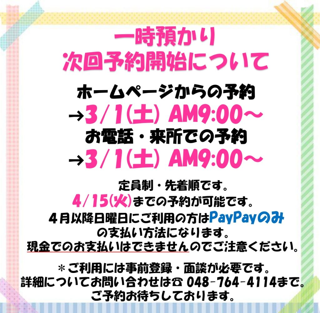 4月の一時預かり予約開始についてのお知らせです。