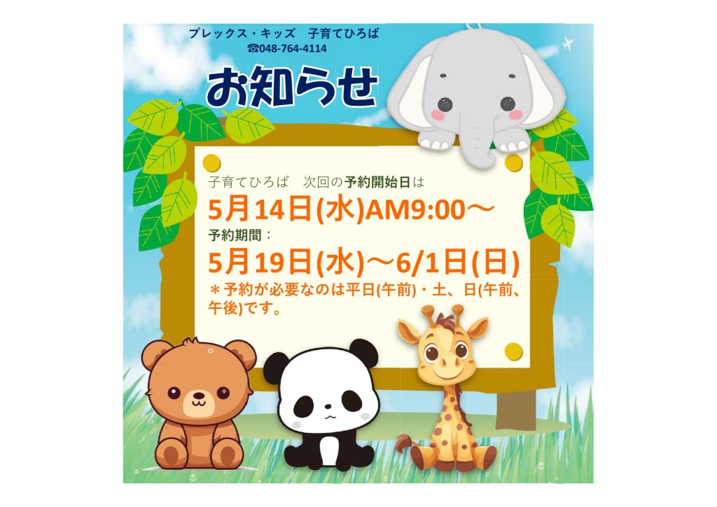 5月19日(月)から6月1日(日)の子育てひろばの予約開始日は、5月14日(水)午前9時からとなります。