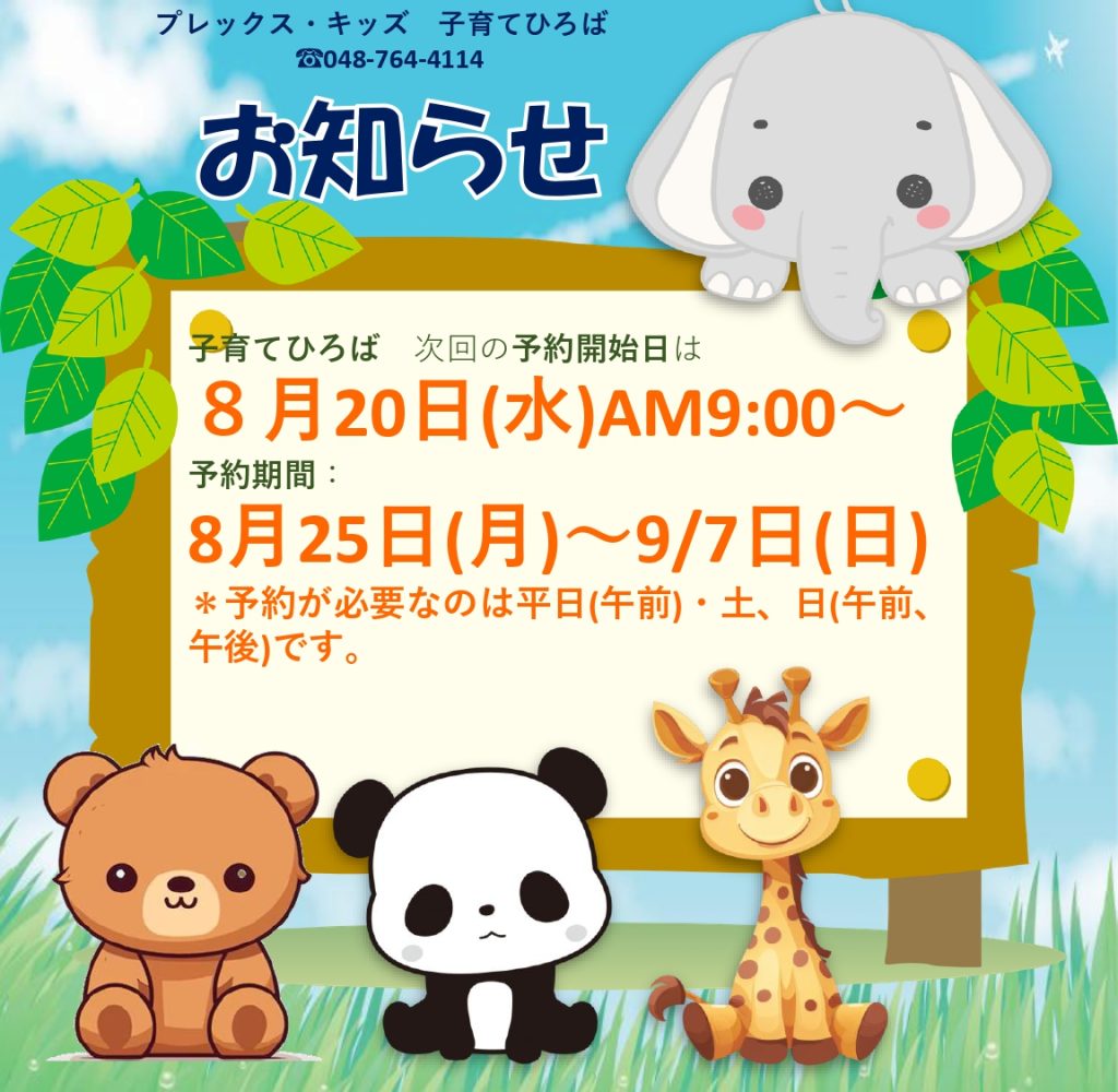 8月25日(月)~9月7日(日)の子育てひろば予約開始について